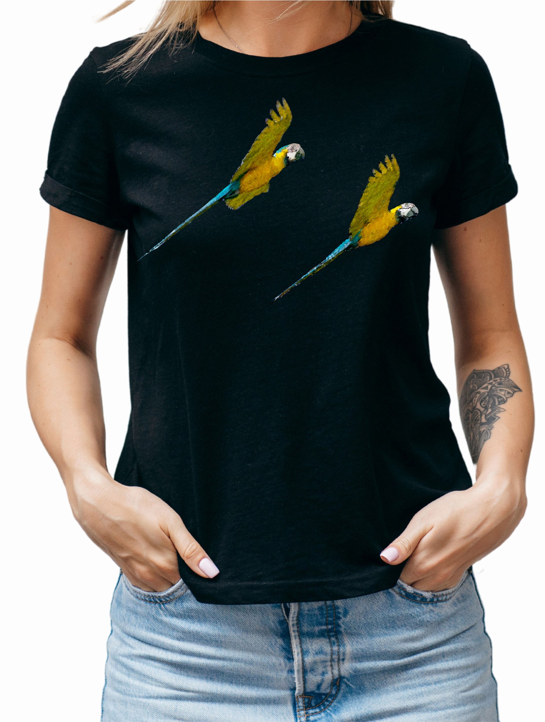 Traga a magia da arara canindé para o seu estilo com nossa baby look estampada! Confeccionada em malha 100% algodão de alta qualidade, essa peça oferece um conforto excepcional e uma pitada de cor ao seu dia a dia.