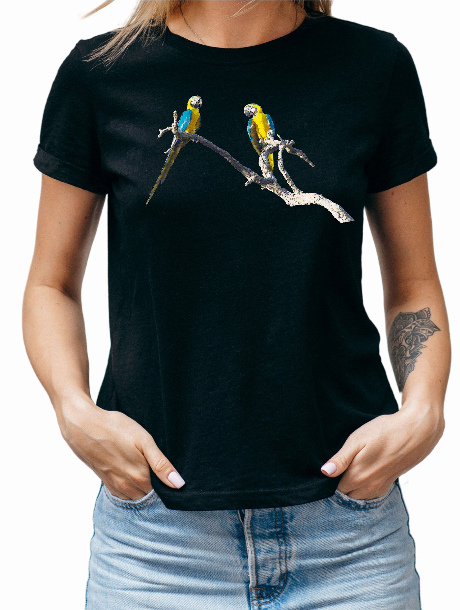 Traga a magia da arara canindé para o seu estilo com nossa baby look estampada! Confeccionada em malha 100% algodão de alta qualidade, essa peça oferece um conforto excepcional e uma pitada de cor ao seu dia a dia.